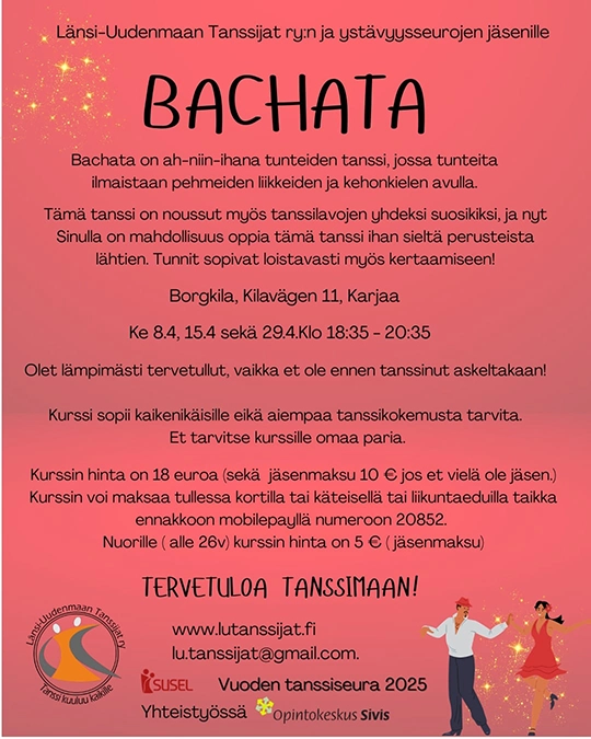 Tanssi ei ole vain askelia ja musiikkia - se on naurua, uusia ystäviä ja hyvää fiilistä. Et tarvitse aiempaa kokemusta, omaa paria tai täydellistä rytmitajua. Tanssi on liikuntaa, joka ei tunnu liikunnalta, ja sosiaalinen harrastus, jossa tutustut uusiin ihmisiin ihan huomaamatta. Länsi-Uudenmaan Tanssijat ry tarjoaa rennon ja kannustavan ympäristön, jossa kuka tahansa voi innostua tanssista. Seurassamme tanssivat niin lapset, nuoret, seniorit, yksintanssijat kuin paritanssijatkin.