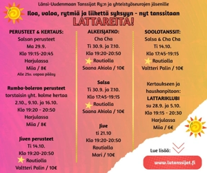 Kurssi sopii kaikentasoisille tanssijoille - olitpa ensikertalainen tai jo kokeneempi parkettien partaveitsi. Tule yksin tai yhdessä, me huolehdimme hyvästä fiiliksestä!